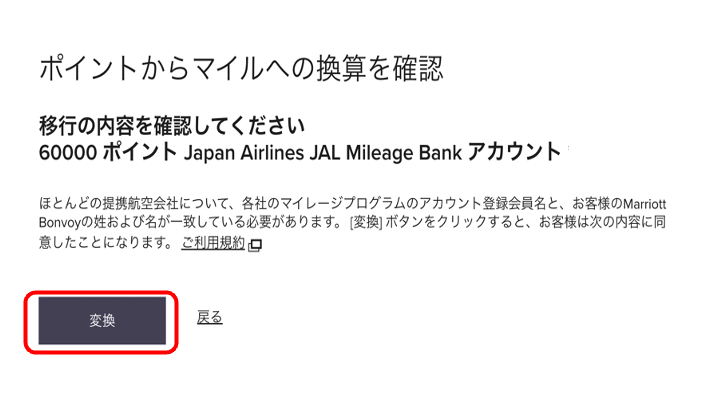 移行先やポイント数に間違いがないかを確認して、「変換」をクリックします。