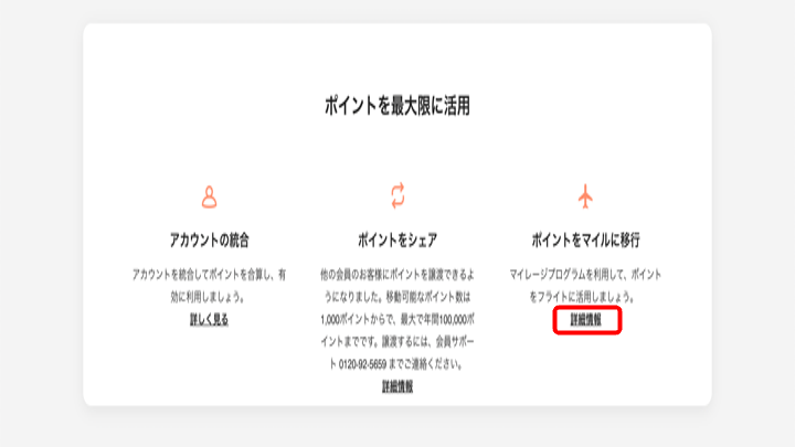 ポイントをマイルに移行したいので、「詳細情報」をクリックします。